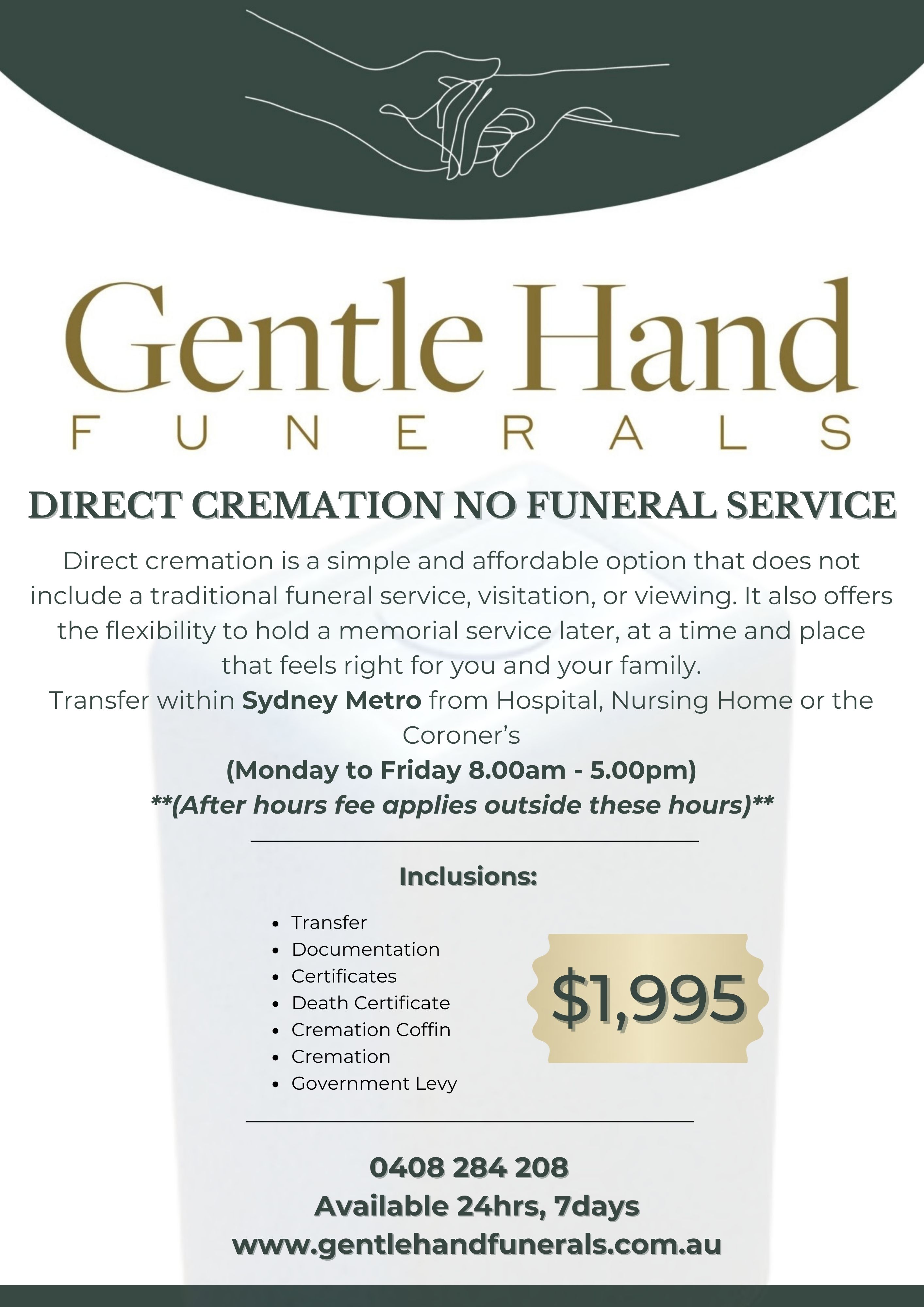 Serving the Sydney Metropolitan area, coastal regions, and selected regional locations, Gentle Hand Funerals offers a compassionate and personal alternative to corporate funeral providers. When you entrust us with your loved one’s care, you can feel confident knowing they will be treated with genuine respect, warmth, and professionalism, at a fair and considered price.
